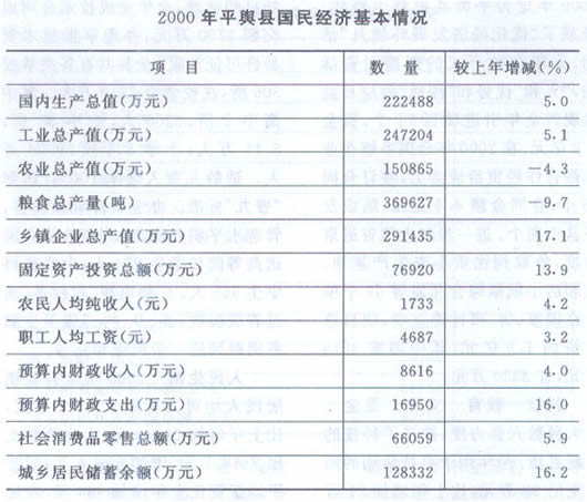 招商引资 县委、县政府把2000年定为平舆县招商引资年,开展了“优化经济发展环境月”活动,采取多种形式的招商引资活动,“人和”优势和“洼地”效应日益显现。全年引进项目71个,资金1.2亿元。在2000年全国乡镇企业东西合作经贸洽谈会上,签订合同95个,合同金额4.6亿元,结成友好县市两个。进一步加大跑省进京力度,争取到优质小麦生产基地东和店小城镇综合开发等59个项目在国家、省、市计委立项,项目总投资约1.5亿元,其中国家4018万元,省3330万元。