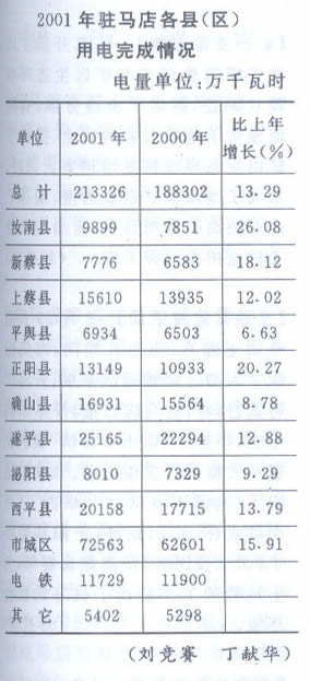 【电力工业概况】一、全市供电量完成21.3亿千瓦时,比上年增长13.29%。其中小网供电量完成18.5亿千瓦时,比上年增长14.09%。售电量完成l7.8亿千瓦时,比上年增长14.45%。售电综合损失率完成4.25%。二、全年累计完成电网建设改造资金约109768万元,其中220千伏主网建设投资6469万元;城市电网改造完成投资2.37亿元,占总投资的95.6%,进度居生省第四位,农村电网改造投资7.96亿元,占总投资的97.2%。全年投运220千伏输变电工程l项,投运110千伏输变电工程8项,35千伏输变电工程7项。通过电网建设与改造,全市电网结构得到加强和完善,供电能力、供电可靠性及供电质量明显提高。三、安全生产局面稳定。全年没有发生人身死亡、重伤事故和重大设备损坏,重大交通事故,没有发生城区电网和大面积停电事故,圆满完成全年安全工作目标,实现安全生产3个一百天。四、加强农电管理,加强对县局的资产经营管理,亏损县局由4个减为2个;完善农村电工统管,精简村电工234人,续聘农村电工2865人;加大规范化管理力度,农村电费收取严格实行“五统一”、“四到户”、“三公开”制度,农网改造后台区实行改后电价,一年内减轻农民负担4400万元,积极推进城乡用电同价工作,遂平、西平两县城乡生活用电将从2002年元月起执行同价方案,加快乡所规范化管理和示范窗口建设步伐,全年建成规范化乡供电所48个,建成规范化电工班190个。五、认真开展“电力市场整顿和优质服务年”活动。以方便客户为宗旨,成立客户服务中心,完善业务流程,提高了客户报装效率;加大服务承诺的执行力度,实行营业大厅无周体日制度和“客户首问负责制”,坚持24小时供电值班,全年处理高低压故障及表计故障近3000起,承诺兑现率100%;实行“零点工程”,控制计划检修次数,杜绝无事故非计划检修,定期对配网进行检查,发现隐患,及时排除,提高了配网的连续供电能力;加快营业现代化步伐,建立技术支持系统,方便了客户报装、报修,咨询、交付电费。六、改善职工生产和生活条件。金发小区9幢职工宿舍楼(324套,建筑面积4万余平方米)开工建设,建成后可基本解决职工住房困难问题,开展创建文明小区工作,按文明小区标准,对电业新村生括小区进行改造,并通过省公司验收。郊区分局和华宇公司变压器有限公司、送变电工程公司配电队、建筑装潢公司、汽车修理厂均搬迁新址;新建职工医院面积3357平方米。按照省电力公司政策,根据效益情况,提高了岗位工资标准,增加了职工收入。