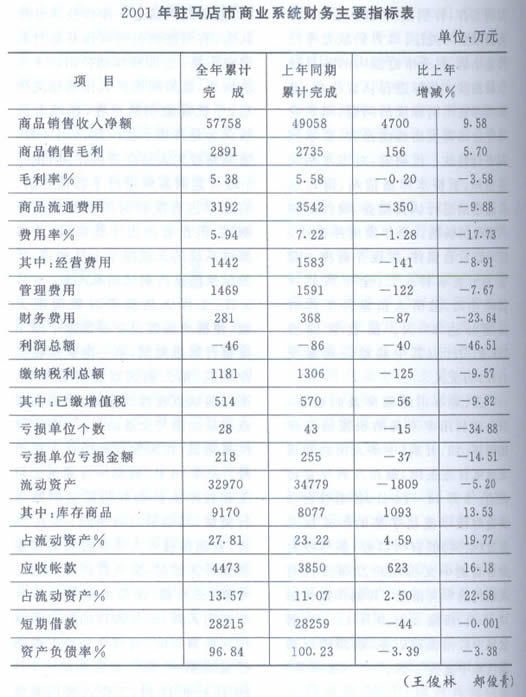 【概况】2001年全市商贸系统认真落实省、市经济工作会议精神,积极整顿市场经济秩序,认真加强行业管理,大力开展扩销增效,取得了一定成绩。全年全市商业完成商品销售5.38亿元,比上年同期增加4700万元,增幅为9.58%,其中市直商业完成商品销售15345万元,圆满完成了1.3亿元的年度目标。全市商贸系统全年利润完成盈亏相抵后净亏损46万元,较上年同期减亏40万元,减亏幅度46.5l%;亏损单位个数比上年减少2个,亏损单位亏损金额比上年同期减少43万元,下降幅度27.39%,较好完成了同比减亏5%的年度责任目标。(王俊林 郏俊青)