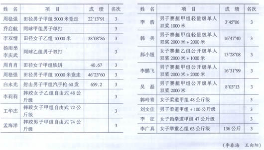 【市政府表彰决定】在2006年举行的河南省第十届运动会上,驻马店市体育代表团实现了历史性的突破,为全市争得了荣誉。其中,摔跤教练张国喜所带队员获得金牌6枚,赛艇教练赵汝刚所带队员获得金牌4枚,田径队教练王文生所带队员获金牌4枚,王新全所带队员获金牌3枚,陈元会所带队员获金牌1枚,柔道队教练员代立新所带队员获金牌2枚,跆拳道教练马建军获金牌1枚。为树立典型,表彰先进,市政府决定给予张国喜、赵汝刚2位同志记二等功,给予王文生、王新全、陈元会、代立新、马建军5位同志记三等功。授予驿城区教育体育局、新蔡县教育体育局“河南省第十届运动会突出贡献奖”;授予市体育运动学校摔跤队、田径队、划船队“河南省第十届运动会优秀运动队”;授予摔跤队领队王睿、田径队领队孙建宏、划船队领队王涛“河南省第十届运动会优秀领队”;授予摔跤队教练张国喜、划船队教练赵汝刚、田径队教练王文生、王新全、胨元会、柔道队教练代立新“河南省第十届运动会优秀教练”。(李春海 王向阳)