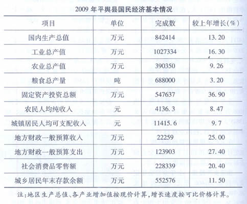 2009年,平舆县全年完成生产总值842414万元,比上年增长13.2%。其中,一、二、三产业增加值分别完成228469万元、359762万元和254183万元,分别比上年增长4.7%、15.4%和17.8%。非公有制经济规模继续扩大,占经济总量的比重达66.2%。全社会固定资产投资完成547637万元,增长36.9%。财政一般预算收入22259万元,增长25%,其中税收收入完成15782万元;财政一般预算支出123903万元,增长27.4%。年末金融机构人民币存款余额656172万元,较上年末增长14.5%;其中城乡居民储蓄存款余额552576万元,较上年末增长11.5%;各项贷款余额205768万元,较上年末下降12.55%。?