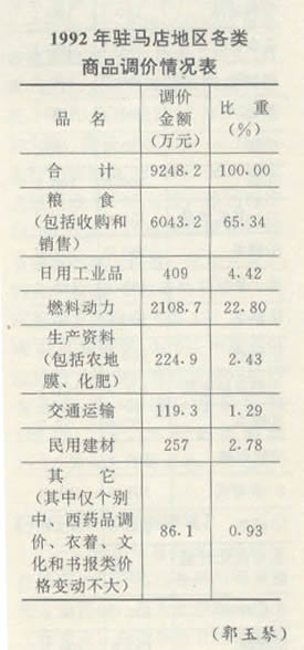 从调价管理权限和调价结果看:由于地、县管理的商品价格绝大部分已经放开,所以1992年调价的商品大部分是中央和省级管理的。93%的调价项目价格到位,仅有7%的调价项目价格不到位,并略有下降。其中粮食、燃料、药品、建筑材料价格及服务;收费受调价影响,指数升幅较大。特别是能源、建筑材料受市场供求拉动的影响(主要是产地),价恪上涨较大。如石油零售价格,1992年上半年,汽油70号每吨价格为1500元,柴油零售价格每吨1300元,到年底汽油上升到每吨3200元,柴油上升到每吨1900元,升幅分别为113.33%和46.15%。钢材销售价格上半年元钢每吨2300元,线材每吨2400元,到年底分别上升到每吨3200元和3500元,升幅分别为39.13%和45.83%。而农地膜由于资源充足,供大于求,再加上1991和1992年连续两年旱涝灾害的影响,农民购买力降低,导致零售价格比调整价平均低200元左右,其降价总金额为24.7万元。