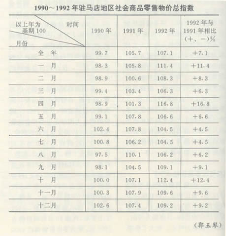 三、价格水平。1992年,全区各类商品零售物价和职工生活费用价格指数除文化娱乐用品类和书报杂志类比去年略有下降外,均呈上涨趋势。(郭玉琴)