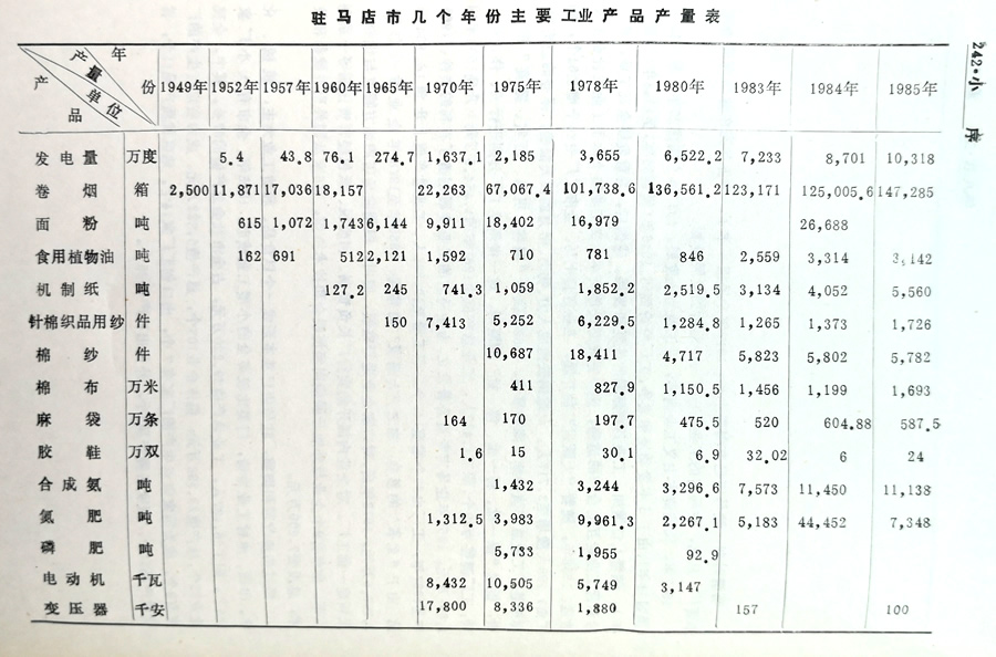 经过初步改革和调整,驻马店已基本形成一个以食品、轻纺工业为主,机械、化学、印刷、建材工业为辅,门类比较齐全的小型工业城市。1985年,全市有大小厂家166个,职工26,187人,工业总产值29,220万元,占全市社会总产值的67%。其中,全民企业63个,总产值23,398万元;集体企业103个,总产值5,822万元。成为省定点生产的厂家有9个,成为国家定点生产的厂家有7个,出口创汇厂家14个。地区优质产品11个,省优质产品31个,国家名牌产品5个,外贸出口产品25个。
