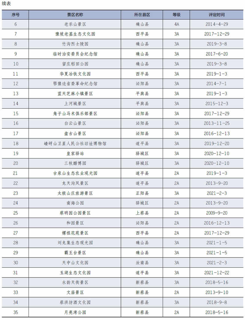 【概况】 2021 年,据统计测算,全年全市共接待游客3600万人次,旅游综合收入247 亿元。广大群众的出游信心和出游愿望正在逐渐增强和迅速提升。积极推进全市A 级旅游景区创建等文化旅游品牌创建工作,嵖岈山景区被文化和旅游部命名为全国首批“国家级文明旅游示范单位”,皇家驿站被命名为全省首批“文明旅游示范单位”;确山县竹沟镇和上蔡县东岸乡命名为“河南省文化产业特色乡镇”;确山县竹沟镇鲍棚村等6 个村命名为“河南省乡村旅游特色村”;正阳县彭桥乡、确山县双河镇等2 个乡镇被评为“河南省特色生态旅游示范镇”;泌阳县生态和园等3 个观光园区被评为“河南省休闲观光园区”,确山县三里河街道乐中创客基地创建为“河南省乡村旅游创客基地”;皇家驿站成功创建为“河南省首批省级旅游休闲街区”,平舆蓝天芝麻小镇创建为第二批“河南省夜间文旅消费集聚区”;泌阳县翠和园成功创建为全省五星级乡村旅游经营单位;汝南天中山文化园,正阳太极山庄,确山霸王台景区、刘龙集生态观光园,遂平玉湖生态文化园等5 家景区创建为国家AAA 级旅游景区。 (叶苏宁)