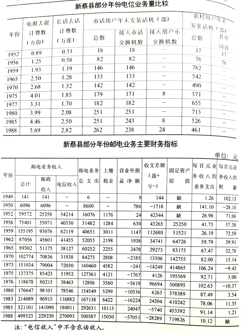 市内电话 民国10年(1921年),县知事公署设10门总机1部,装电话机13部(其中4城门楼各1部)。民国13年,县公署总机室改设为新蔡县电话局。民国19年,实行市、农、长话合一,市内装机20部,主要供党政军界使用,均为1线1地通话。民国37年,电话局关闭,人员撤离。同年,县民主政府利用原电话局的1部10门总机设立总机室,装话机2部,仅供党政军机关免费使用。1950年,开始架设空中明线,当年架设6.9对公里,杆路长2公里,装机10户。翌年起,随着用户的不断发展,市话交换机容量相应扩大,1951年25门,装机18户,1953年75门,装机37户,1955年增至55户。1957年,始架空中电缆0.5皮对公里,缆芯长30.1对公里,杆路长4.7公里,明线增至23.8对公里;交换机容量由1950年的10门增至100门,装机91户。1965年,线路发展到:明线34.6对公里,电缆1.65皮对公里,缆心94.88对公里,杆路12.5公里,交换机增至2部,容量200门,装机133户。1974年起,部分用户开始安装小容量交换机,县邮电局交换机增至3部,容量300门;1977年后,市话业务迅速发展,至1985年.计有明线57对公里、电缆6.6皮对公里、缆芯长548.4对公里,杆路23公里。1986年,县局交换机发展为4部400门,翌年达5部500门;话务员由1949年的4名增至16名。1988年末,市话用户安装话机262户,其中入市话交换机者238户,接入用户交换机24户。