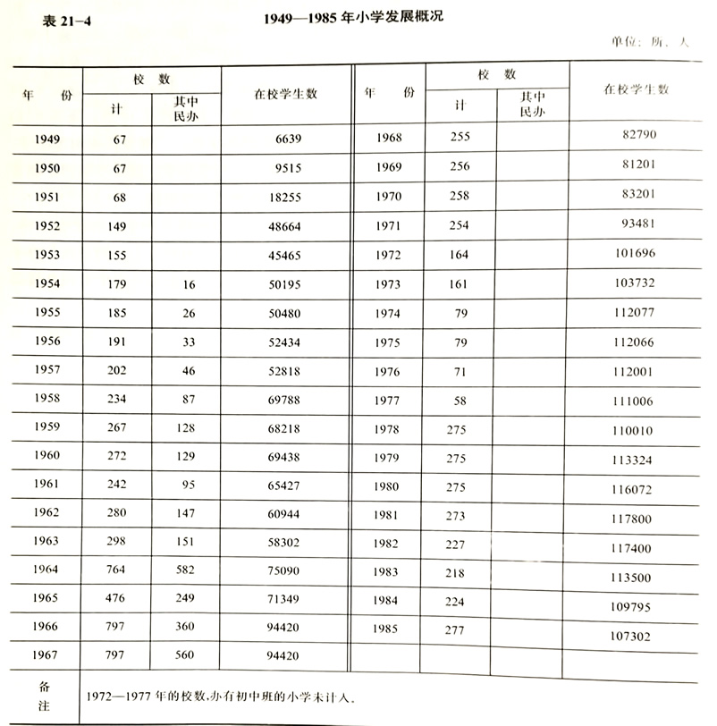 由于小学教育的不断发展,全县学龄儿童入学率逐年提高,1965年为92.7%,1979年为94.8%,1982年为96%。1985年,入学率上升到98.6%,巩固率为98.8%,毕业率为96.2%,普及率为98.3%,超过教育部规定的基本普及初等教育的标准,被定为小学教育基本普及县。