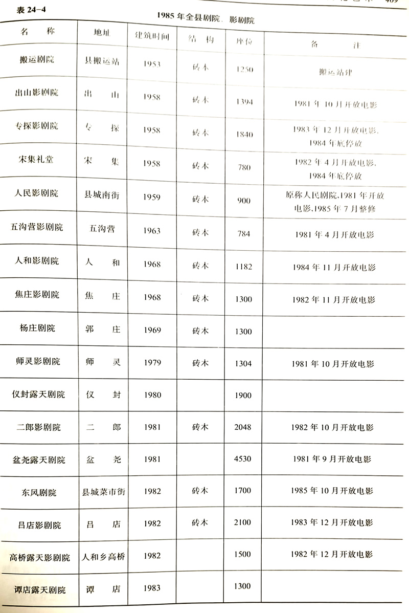 1972年,在农村公社建立电影放映队17个,5个县直单位亦先后建立放映队。1974年底,全县放映单位47个,放映员170人。1977年,原属电影管理站的17个放映队移交所在公社。1979年后,电影放映体制改革,国营、集体、个体三种经营形式并存。1981年9月,在菜市街路北建露天电影院,设水泥板座位1576个。1984年冬,人民影院添置立体电影偏转镜头,首映立体影片。1985年7月,影院翻修,设地道通风设备,座位1250个。年底,全县有放映单位152个,其中国营4个、集体82个、个体66个,放映人员近300人;电影院、影剧院14处,放映点62处。