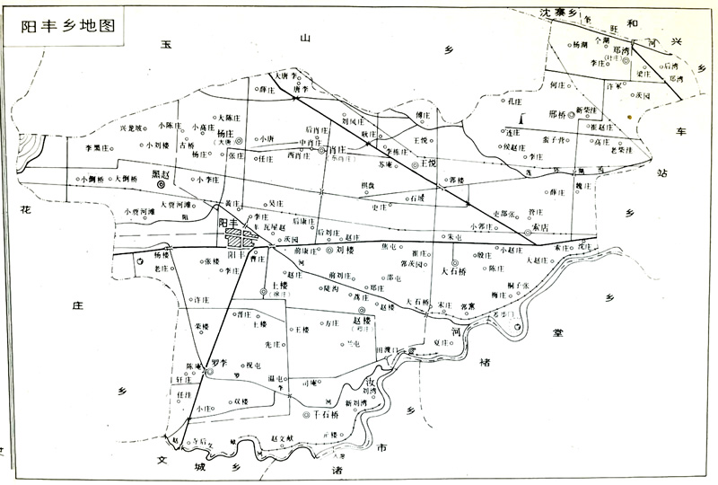 东西街与南北街垂直相交,供销社、经联社、乡政府、派出所、税务所、电影院、粮所在东西大街两侧,银行、信用社、手联社、生产门市部分布于南北大街两侧。