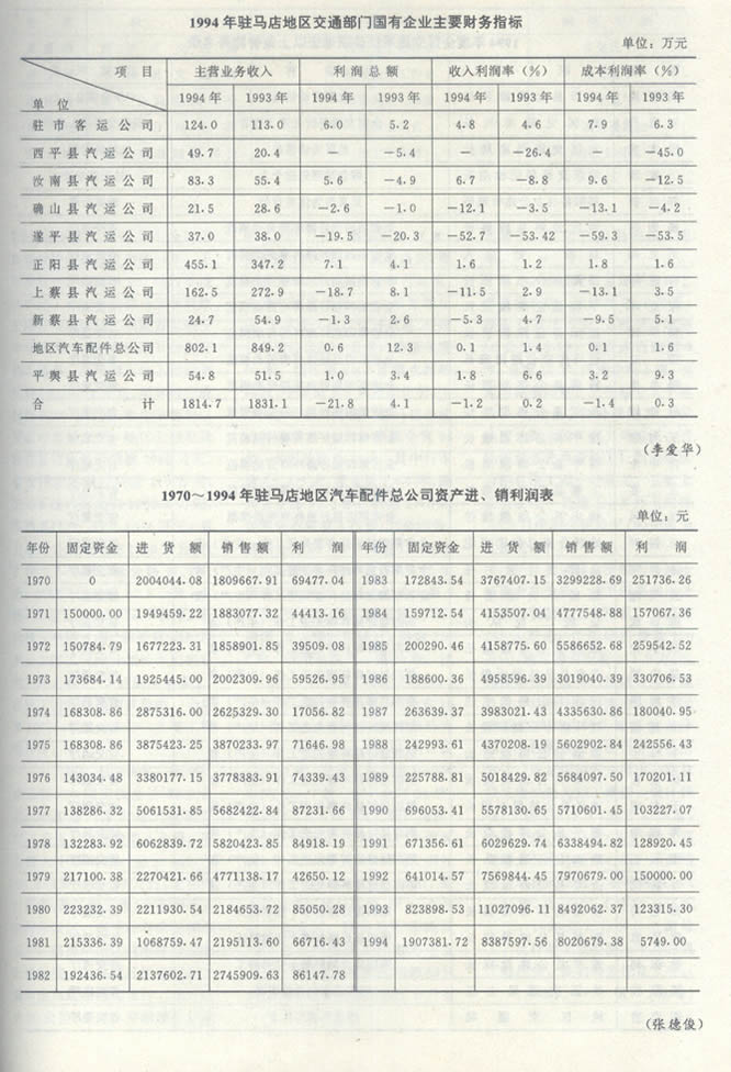 【公路交通概况】 1994年,全区公路交通运输部门以加快基础设施建设和强化行业管理为重点,统筹兼顾,全面发展,较好地完成了各项目标任务。全年共完成客运量5642万人次,旅客周转量175222万人公里;货运量1416.1万吨,货物周转量53856.3万吨公里。国有企业西平、汝南、确山、遂平、正阳、上蔡、新蔡、平舆县汽车运输公司、驻马店市客运公司和地区汽车配件总公司共计完成主营业务收入1814.7万元。