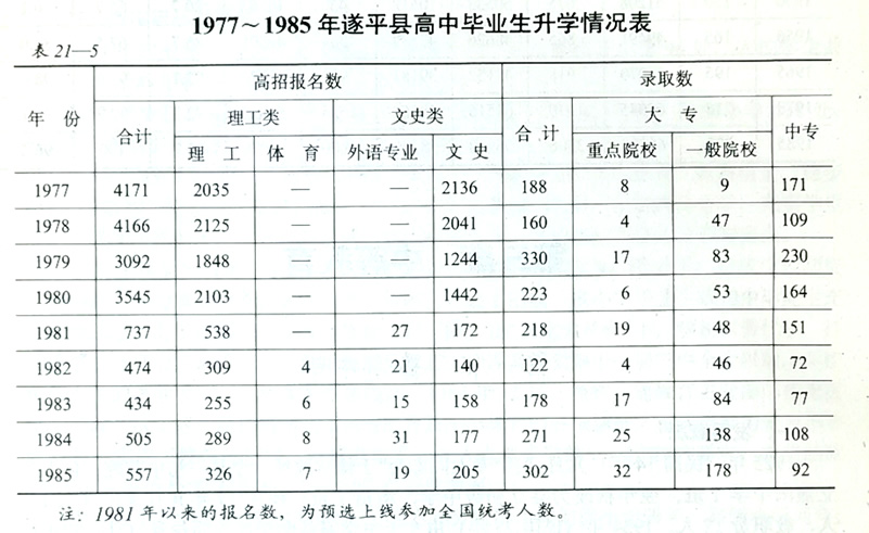 “文化大革命”中废除升学考试制度,实行由基层单位推荐,政府批准的推荐制度。1977年恢复全国统考制度。从全国恢复高招统考制度后,遂平高中毕业生升人高一级学校深造的升学比例在驻马店地区年年居于上游。