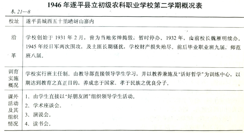 1959年招收一年制技工学校,农业技术学校学生18班1017人,但学习条件极差,不久即停办。1963年秋,全县公社办农业中学12处,招生468人。学生以学普通中学课为主兼学农业课。1966年“文化大革命”开始学校停办。1980年改革中等教育结构,职业教育又得到发展:石寨铺、沈寨、关王庙先后办起一年制农业学校,到1984年下期共有学生3班116人,教职员17人。开课有:良种繁育、植物保护、土壤分析、农作物栽培等,但坚持时间不长。