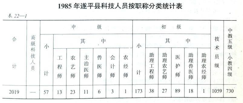 1980~1985年,先后对技术干部进行技术职称评定,经技术职称评定委员会的考核、审查,报地区行署批准,评定中级技术职称57人,初级技术职称173人,技术员1059人,中教五级、小教四级的教师730人。生活待遇方面,凡助理级以上和1976年以前毕业的大专毕业生,以及小教3级、中教5级以上的教师都可解决家属迁城问题。止1985年底,全县由农业户口转人非农业户口251户,859人,安排子女就业205人;大部分科技人员搬进新房。