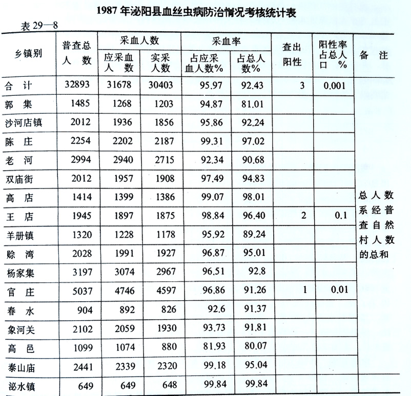 血丝虫病防治 1970年对血丝虫病进行全民普查,全县共查出患者67051人,占总人数的10.04%。其中乳糜尿、橡皮肿12人。属中度流行区。县内分类:马谷田、大路庄、王店、陈庄、杨集5个公社为高度流行区;板桥、春水、官庄3个公社为中度流行区;郭集、羊册、太山、赊湾、城关、沙河店、立新7个公社为低度流行区。所查病例全是斑氏丝虫。是年,开始组织丝虫病防治专业队12个,共250人,进行全民性普查普治。除1975、1977两个年份外,直到1980年,每年普查一次。方法是:以自然村为单位逐人采血检验,每次采血镜检人数均在应采血人数的95%以上。对查出患者,全部登记入册,然后用三日三克或五日三克海群生疗法,全程足量三个疗程,正规治疗。据卫生防疫站历年统计,总共采血镜检3112175人次,查出患者67051人,全部施治,治愈65931人,治愈率为98.3%。未愈1120人,占患病人数的1.7%。