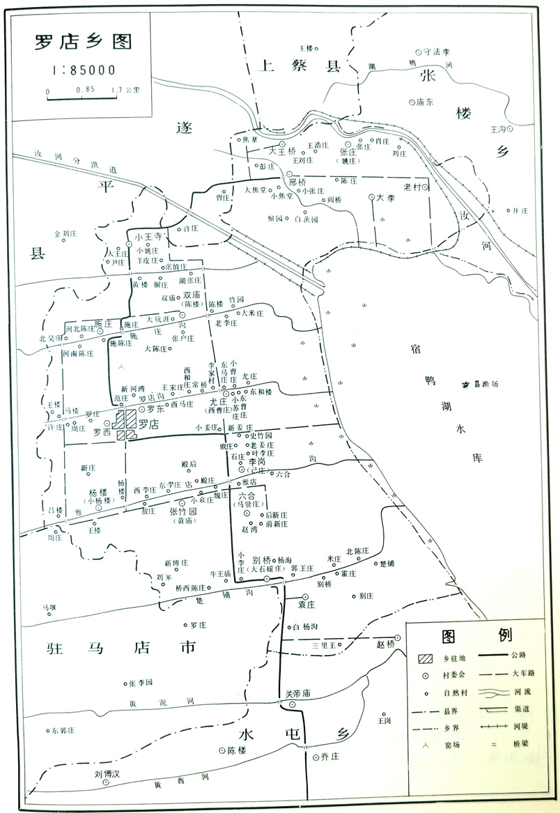 地形西高东低,属平原地带。境内有宿鸭湖南干渠从乡政府南侧自西向东穿过,汝水(原臻头河段)流经北边沿。全乡总耕地面积107636亩,其中,水浇地面积12000亩。土壤多数为白散土和黄土,沿汝河(原为臻头河)流域为黄沙壤土,易受水、旱灾害。