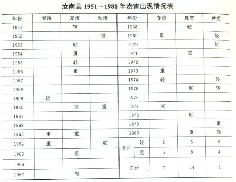 (2)夏涝 指6月至8月间出现的雨涝。30年来发生频率为46.7%,重的夏涝发生频率为26.7%,是涝害发生最多的季节,危害也很严重。1956年6月上旬,连降暴雨357.1毫米,8月份又出现两场大暴雨,全县受洪涝灾害的农田近84万亩。1975年8月4日至8日连降暴雨,最大日雨量446.6毫米,全县受灾面积126万亩,是汝南县历史上少有的特大夏涝。