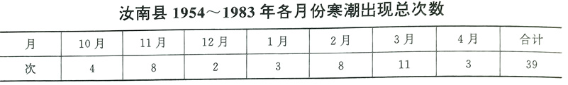 据1954年到1983年的资料记载,汝南出现寒潮共有39次,平均每年出现1.3次。最多年出现4次,出现时间在冬、春二季,其次是秋季。寒潮出现最早在10月14日,最晚出现在4月9日,汝南县寒潮出现在10月至11月和3月至4月阶段,危害严重。