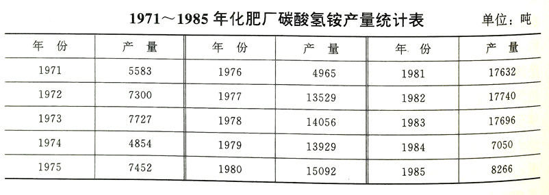 该厂属于支农型地方“五小工业”,设备及工艺落后,产量低,能耗高,加之电力供应紧张,投产15年,10年亏损,5年微利,年年吃国家补贴。1979年后,该厂以提高经济效益为中心,狠抓技术改造,革新挖潜增强设备配套能力,1980年,使合成氨生产能力达到3951吨,1984年达到5365吨,1985年又达到6259吨。这年,固定资产达到696万元,拥有专用设备289台(套),各种管道
