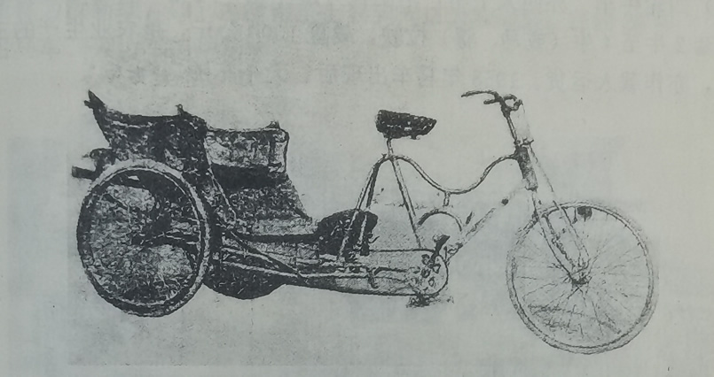 (4)三轮车 始于民国26年(1937年),品字形,有单座和双座两种,分前踏和后踏两类,充气轮胎,传动链条,半机械化,省力,速度较快。主要用于城郊客运,载1至2人,现仍使用。
