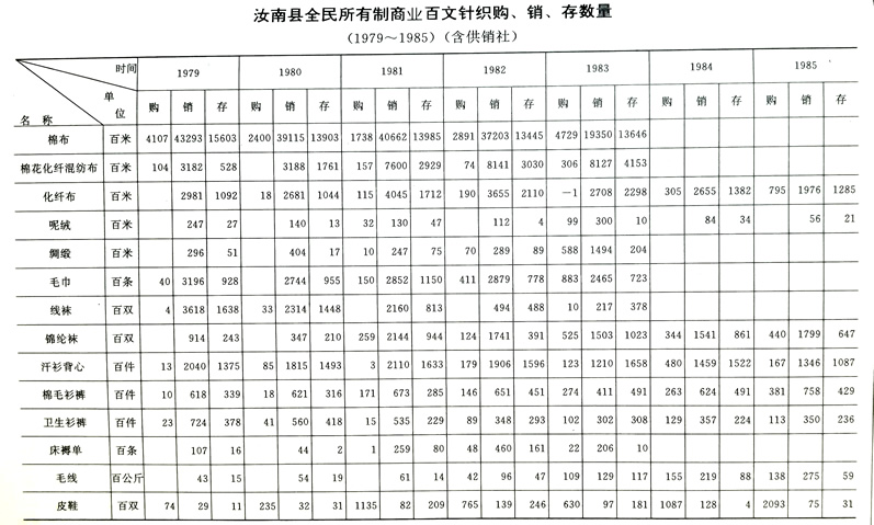 建国初期,国营、合营商业尚处初建阶段,城乡物资交流商品,仍由私营商业经营。在国民经济恢复时期,对私营工商业者采取“加工、订货、贷款、收购”等形式,鼓励其积极购回针织布匹、日用百货、烟酒副食、竹木家具等,以满足城乡需要。后,供销合作社、县贸易公司、百货公司、花纱布公司、烟酒专卖经营处先后建立。当时多是购进些工业品和土特产品。工业品购进,按行政区划,统一由专业公司分配。供销合作社和贸易公司以收购粮食、麻、油、猪、牛、羊、蛋、鸡、煤油、食盐、食糖、粉条、粉面、条编、小件农具等商品为主;花纱布公司以收购棉花、土布为主;专卖经营处以销烟酒为主;百货公司经营针织布、鞋类、肥皂等商品。由驻马店、确山二级站中转购进。1958~1960年,由于“左”倾错误影响,加上三年自然灾害,忽视了计划管理平衡,使商品购、销、调、存之间的比例关系失调,造成货不对路,商品积压的现象。