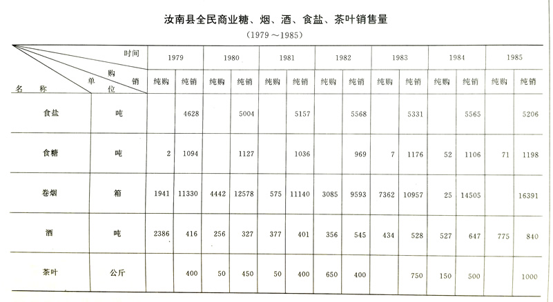 建国前,烟、酒、糖、食盐等副食品由私人经营,抗日战争时期,常因交通受阻,食盐供应缺乏,农民往往用30~50公斤粮食换1公斤食盐。1951年,县成立糖、烟、盐专卖处,随又组建供销社,国营、集体、个体商业共同经营副食品以满足市场需求。1958年,由于“左”倾思想影响,个体商贩被取消,集体商业、供销商业都过渡为国营商业,副食品由糖烟酒公司、基层商业店部经营,食盐、红糖、白糖为计划调拨,烟、酒等自行采购。1959~1961年后,取消高价商品。“文化大革命”中,副食品供应又一度紧张,中共十一届三中全会后,随着市场的开放,副食品经营网点遍布城乡,品种不断增多,货源日益充足。1985年,国营、集体、个体经营副食品的商家达4390户。销售额达1444万元。