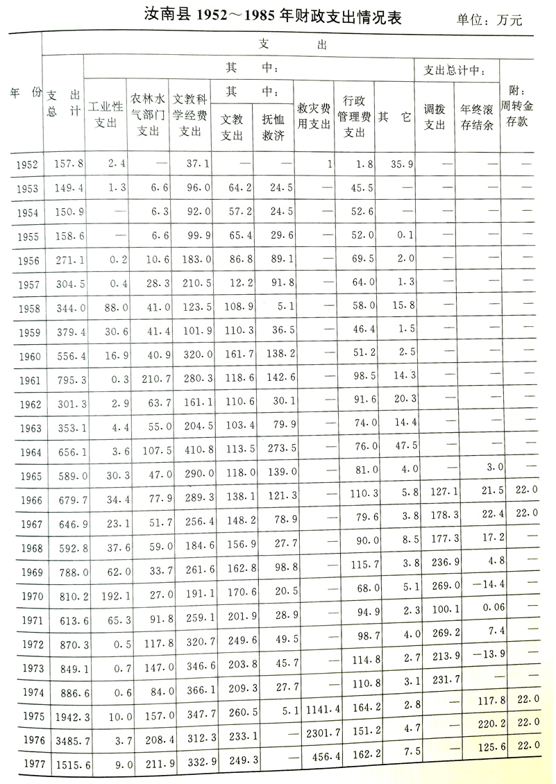预算分成比例为5%。1974年后采取“按固定比例留成,超收奖励,支出包干,超支不补,节约归己”的财政体制。1976~1979年,实行“定收定支,收支挂钩,总额分成,一年一变”的体制。省对县实行“增长分成,统收统支,多收多支,少收少支,自求平衡”的原则。1980年后,贯彻中央“调整、改革、整顿、提高”的方针,省对县推行“划分收支、分级包干、节约归己、一定五年”的管理体制,县对乡、镇及县直各单位的各项收入,支出包干基数都作了具体规定,以适应经济体制改革的需要。