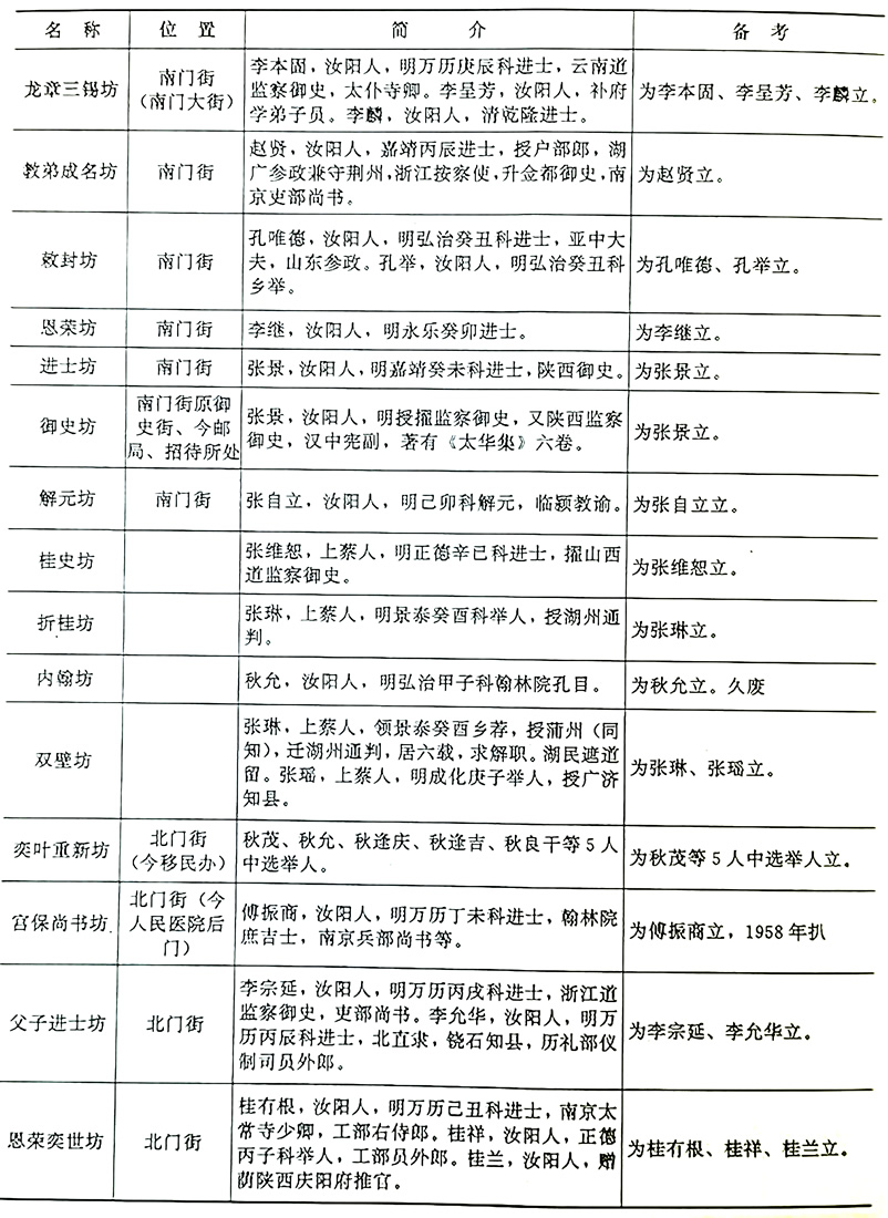 历代在县城各街道跨路树立石刻牌坊,计有114座,除贞节烈女坊19座外,多为功名坊。其中较早毁塌的70座,仅有51座延至民国。至1949年完整的牌坊有24座。不少牌坊,高大古朴,巍峨壮观,图案优美,雕刻精湛。1958年全部扒掉。