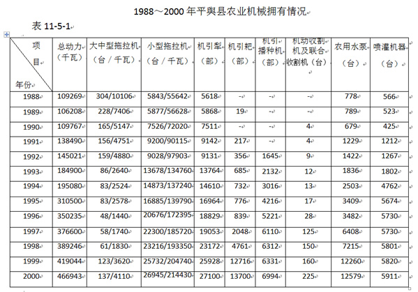1988年,全县农业机械总动力109269千瓦,大中型拖拉机304台, 各种小型拖拉机5843台,当年机耕地545565亩,机播面积1800亩,机收面积176391亩,农业机械化水平较低。1988年后,由于农民各家各户的责任田地块较小,大中型拖拉机使用不方便,各种小型拖拉机发展迅速,到1995年,全县大中型拖拉机减少到83台,而各种小型拖拉机数量增至16885台,农业机械总动力增至310500千瓦,当年机耕面积1099140亩,机播面积1157805亩,机收面积1426545亩。2000年,全县农用机械总动力达到466943千瓦,各种型号的小型拖拉机26945台,大中型拖拉机137台。每万亩耕地拥有拖拉机246台,配套机具同步发展。2000年,全县共有播种机6994部,较1988年14部增加了6980部;有小型割晒机5709部,较1991年1463部增加了4246部;大中型联合收割机118部,小型联合收割机170部,较1996年的15部增加273部;喷灌机械5911部,较1988年增加5345部。2000年,全县共完成机耕面积1189695亩,机播面积2180550亩,机收面积2218500亩。农业机械化水平的大幅度提高,使众多农村剩余劳动力从土地上分离出来,促进了二、三产业的发展。