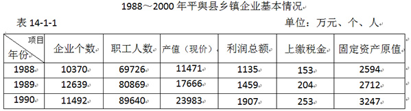 平舆县乡镇企业基础差,起步晚,1987年居全省第87位。1988年初,县委、县政府调整发展方向,把乡镇企业作为农村经济的重要支柱和农民脱贫致富奔小康的战略重点来抓,采取乡、村、组、联户、个体经营,多形式、多层次、多模式快速发展乡镇企业。是年,全县乡镇企业发展到10370家,从业人员达到6.9万余人,企业总产值(当年价,下同)1.15亿元,利润总额1135万元,上缴税金153万元,固定资产原值2594万元。