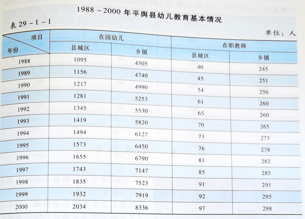 1988年,全县幼儿园(含学前班)95班,入园幼儿5600人,幼儿教师285人。根据国家幼儿教育的方针政策,从1990年开始,县、乡、村大力发展幼儿教育,扩建了县直幼儿园,各乡镇中心小学及条件较好的村办小学相继开设幼儿园或学前班。到2000年,全县幼儿园(含学前班)已发展到11所226班,入园幼儿10370人,幼儿教师395人,每万人入园幼儿112人。各级幼儿园(含学前班)认真贯彻落实国家教育委员会颁发的《幼儿园教育纲要》,按国家教育委员会的要求开设课程,对幼儿加强思想品德教育和综合教育,促进幼儿全面发展。幼儿教育因城乡条件不同,在班次安排和课程开设上有差异,条件较好的县直幼儿园,按幼儿年龄分设小班(3~4岁)、中班(4~5岁)、大班(5~6岁)。县直幼儿园和条件较好的乡镇中心小学幼儿园一般分大班、中班与小班,课程开设有语言、算术、常识、美术、音乐、体育、手工制作等。条件较差的乡村小学附设幼儿园,又称学前班,无大、中、小班之分,课程与活动安排和县城幼儿园有一定差异。