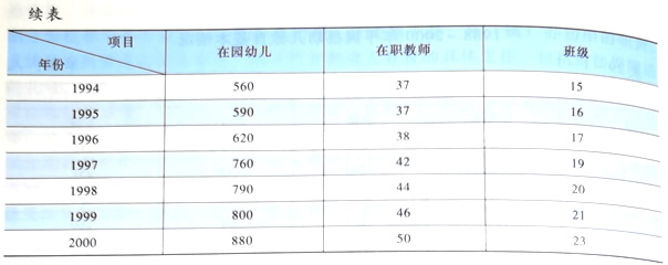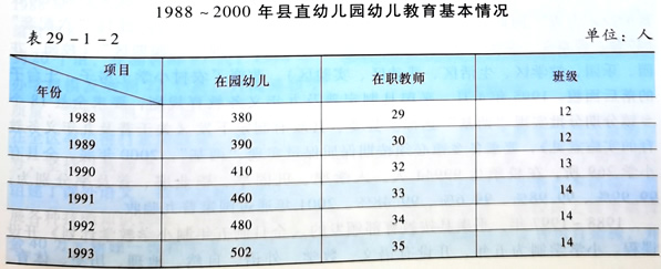 1988年,县直幼儿园是县城区唯一一所幼儿教育学校,有12班380人,幼儿教师29人。随着县城区人口的不断增加,入园幼儿人数也随之增长,1992年入园幼儿480人,发展到14个教学班,幼儿教师34人;1998年增加到790人20个班,幼儿教师44人;2000年发展到880人23个班,幼儿教师50人。县直幼儿园教学使用全国统编教材,课程开设有语言、算术、常识、美术、音乐、体育、手工制作等。
