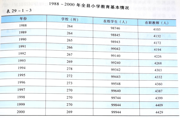 随着教育事业的发展和教育体制改革的不断深入,基础教育得到巩固提高,成人教育、职业技术教育得到较快发展,社会力量办学取得显著成绩,办学条件逐步改善。2000年,全县有幼儿园(含学前班)226班,入园幼儿10370人;小学269所,在校学生99944人,每万人有在校小学生1076人;初中33所,在校学生37913人,每万人有在校初中生408人;高中5所(含职业高中3所),在校学生5689人,每万人有在校高中生62人。