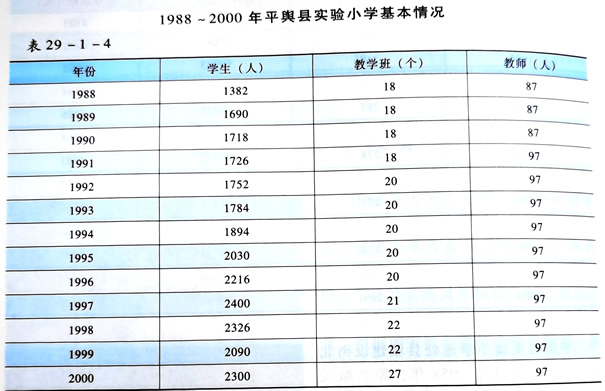 1988~1997年,平舆县按教育部颁发的《全日制五年制小学教学计划》开设课程。小学学制为五年,开设有语文、数学、外语、自然、地理、历史、体育、音乐、美术等课程。全年教学时间为40周,假期为12周。1997年后,全县各小学增设劳动(制作)、法律(社会)、微机等课程。每周授课时间为24~30节,学生每天在校时间控制在6小时,最长不超过7小时。