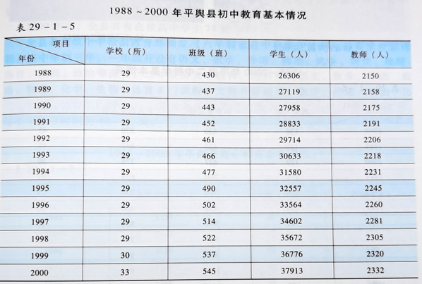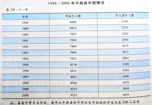 1988年,全县有初中29所,在校学生430班26306人。为贯彻《中共中央关于教育体制改革的决定》精神,平舆县人民政府下发《平舆县人民政府关于贯彻《中共中央教育体制改革的决定>的意见》,对全县基础教育的发展提出了明确的目标,制定了具体的措施。要求在普及小学教育的基础上,把工作重心转移到发展初中教育上来。