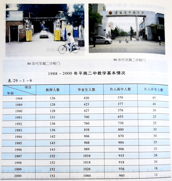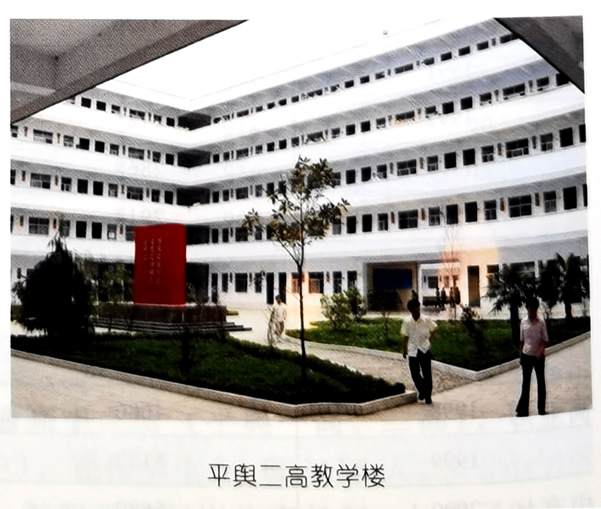 平舆县第二高级中学 1981年,利用原平舆师范校舍成立平舆县第二高级中学(简称县二高)。第一学期,学校规模为7个教学班,其中高中班3个,初中班4个。1983年学校发展到12个教学班(高、初中各6个班),在校学生852人,其中高中生347人,教职工67人。1984年6月,县二高被列为科级单位,学校规模为12个教学班,在校学生1076人,教职工75人。1986年9月,学校将初中部移交给城关镇中,成为12个教学班的全日制高中。1988年,18班规模教学楼落成。1989年,一高、二高实行划片招生,每年全县有6个乡归县二高招生,县二高的生源状况开始好转。1991年,县二高招生范围扩大到8个乡,在校学生迅速增加。1993年7月,为适应学校发展需要,县政府将县劳动服务公司培训楼划给二高使用。