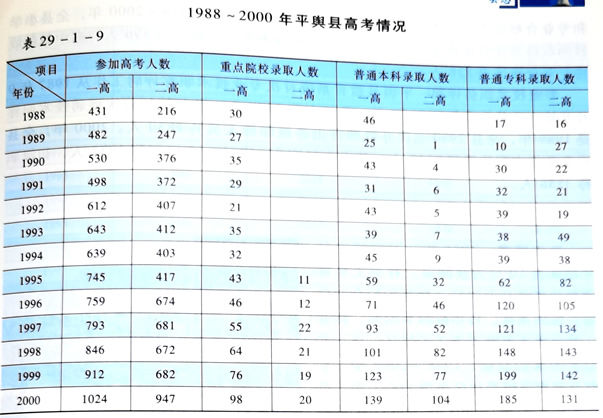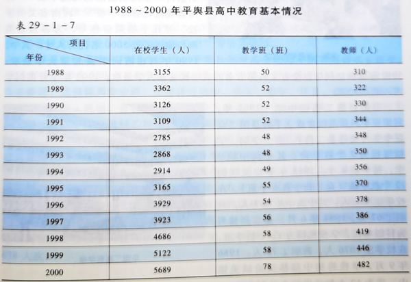 1988年,全县有高中5所,其中普通高中2所(平舆一高、二高),职业高中3所(射桥高中、万冢高中、杨埠高中),在校学生50班3155人。