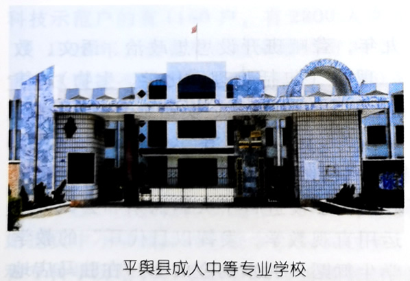 80年代末,平舆县职业教育学校有卫生学校、商业学校、供销学校、粮食学校。随着市场经济迅速发展,流通系统逐步放开,商业学校、供销学校、粮食学校90年代初停办,需培训人员由其他实用技术学校代培。