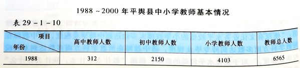 专业技术职务评聘 平舆县教育系统首次专业技术职称评聘工作从1987年9月开始。全县公办教师3670人,参评人数3590人。民办教师首次评聘技术职称是1989年,全县2930名民办教师评出各级职称人员共2850人。2000年,全县有专业技术职称教师6440人,其中高级职称650人,中级职称1932人,初级职称3858人。