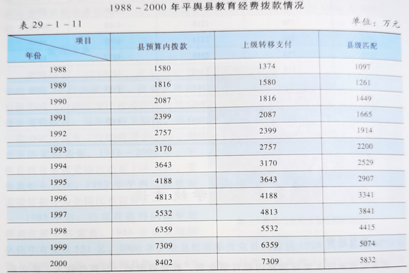 1988年,平舆县仅第一高级中学、第二高级中学、实验小学、第二初级中学和古槐镇初级中学5所学校有教学楼,其他学校均以砖瓦结构校舍为主。随着国家对教育事业的重视,各级政府对教育的投入逐年增多,加上各种教育集资,全县教学条件得到很大改善。1988~2000年,全县为改善办学条件,累计集资、投资9800万元。2000年,全县教学楼有184幢,校舍面积4100万平方米。