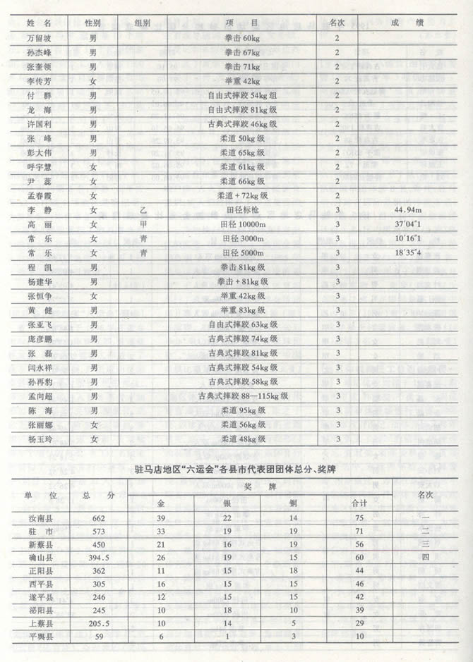 【举办地区第六届运动会】 经地区行署批准,地区“六运会”于1995年9月在驻马店市举行。这是4年一度的一次大型综合性体坛盛会。大会共设田径、摔跤、柔道、拳击、举重、乒乓球、篮球等13个项目。全区9县1市10个代表团参加,参赛运动员及工作人员达1300多人,无论设置项目或参赛人数均超过以往历届运动会。经过运动健儿顽强拼搏,激烈角逐,207块金牌、4136分,各有得主,创造了一批新纪录、涌现出了一批先进单位和体育新秀。汝南县以团体总分662分,金牌39枚、银牌22枚、铜牌14枚的好成绩名列第1名;驻马店市列第2名;李静、武平方等12人打破9项地区最高纪录,为发展区内体育事业做出了贡献。“六运会”期间举行了数万群众参加的盛大开幕式和异彩纷呈、引人入胜的闭幕式。地委、行署四大班子领导均出席指导观看。(彰立贵)