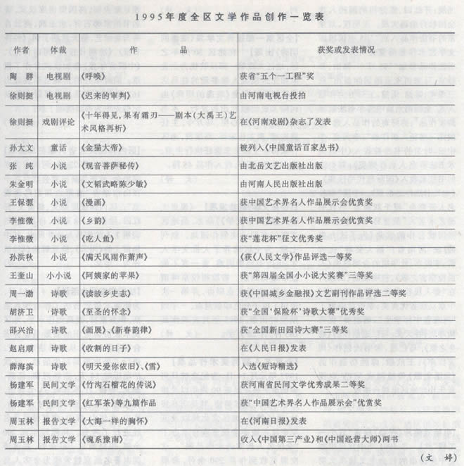 1.文学创作。在电视剧、小品创作方面;陶群的电视剧《呼唤》获省“五个一工程”奖;徐则挺的第五部电视剧《迟来的审判》,由河南电视台投拍,这是我国第一部以环保为主题的电视情节片。另外,区内作家创作的剧本《嫁娘记》、小品《妮旦和尾巴》及戏剧评论《十年得见、果有霜刃—剧本(大禹王)艺术风格再析》也得到社会各界的好评。在小说、散文、诗创作方面:张纯的小说《观音菩萨秘传》由北岳文艺出版社出版,张纯还主编了《魔鬼罪行录》的一至四集;河南人民出版社出版了朱金明的《文韬武略陈少敏》;王保源的小说《漫画》、李惟微的《乡韵》获中国艺术界名人作品展示会优赏奖,杨惟微的《吃人鱼》获“莲花杯”征文优秀奖;孙洪秋的《满天风雨作萧声》获《人民文学》一等奖;周一渤的诗《读故乡史志》获《中国城乡金融报》文艺副刊作品评选二等奖;王奎山的小小说获“第四届全国小小说大奖赛”三等奖;胡济卫的《至圣的怀念》获“全国‘保险杯’诗歌大赛”优秀奖;邵兴治的《画展》、《新春韵律》获“全国新田园诗大赛”三等奖;赵启顺的诗《收割的日子》在《人民日报》发表:薛海滨的《明天爱你依旧》、《雪》入选《短诗精选》一书。在民间文学方面,杨建军的《竹沟石榴花的传说》获河南省民间文学优秀成果二等奖;他的《红军茶》、《张九英打鬼》、《乐山蓝牡丹》、《打狗潭与将军柱》等九篇作品获“中国艺术界名人作品展示会”优秀奖,作者被收入《中国当代艺术名人录》。在报告文学创作方面,周玉林的《大海一样的胸怀》在《河南日报》发表,《魂系豫南》被收入《中国第三产业》和《中国经营大师》两书。在童话创作方面,孙大文的童话《金猫大帝》被列入《中国童话百家丛书》。