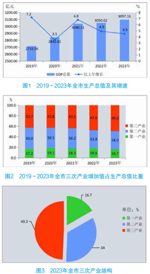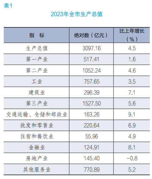 注 :1. 本公报 2023 年数据为初步统计结果。经最终核实,2022 年全市生产总值为 3050.62 亿元,比上年增长 4.9%,三次产业结构为18.6:33.8:47.6。部分数据因四舍五入的原因,存在总计与分项合计不等的情况。