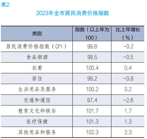 全年居民消费价格(CPI)总水平比上年下降 0.2%,其中 :食品烟酒类下降 0.5% ;衣着类上涨 0.4% ;居住类下降0.8%;生活用品及服务类上涨0.2%;交通和通信类下降2.6%;教育文化和娱乐类上涨 1.7% ;医疗保健类上涨 1.3% ;其他用品和服务类上涨 2.3%。