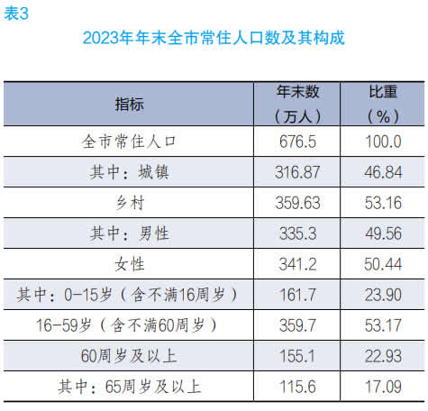 年末全市常住人口 676.5 万人,其中城镇常住人口316.87 万人,乡村常住人口 359.63 万人 ;常住人口城镇化率为 46.84%,比上年末提高 1.03 个百分点。全年出生人口 4.6万人,人口出生率为 6.73‰ ;死亡人口 6.2 万人,人口死亡率为 9.07‰;自然减少人口 1.6 万人,自然增长率为 -2.34‰。