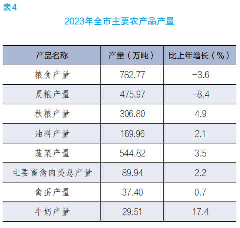 全年粮食产量 782.77 万吨,比上年下降 3.6%。其中,夏粮 475.97 万吨,下降 8.4%;秋粮 306.80 万吨,增长 4.9%。油料产量 169.96 万吨,增长 2.1%。蔬菜产量 544.82 万吨,增长 3.5%。