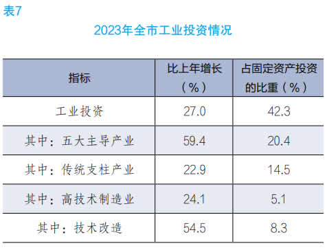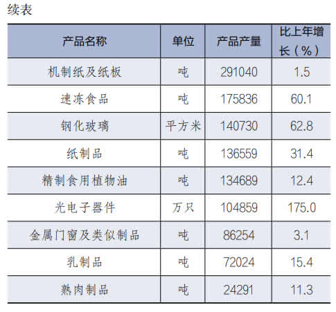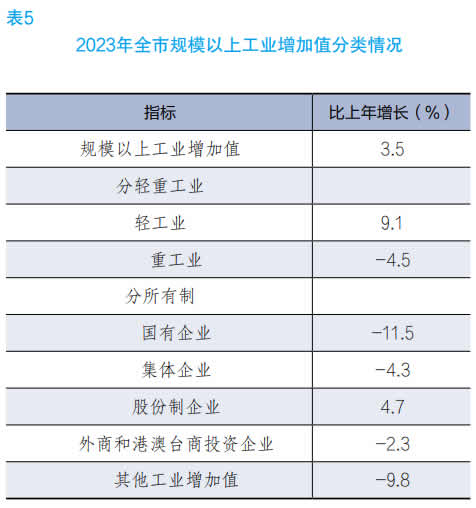 全年规模以上工业增加值比上年增长 3.5%。分轻重工业看,轻工业增加值增长 9.1%,重工业下降 4.5%。分门类看,采矿业增加值下降 6.0%,制造业增长 5.6%,电力、热力、燃气及水生产和供应业下降 9.0%。分所有制看,国有企业增加值下降 11.5%,集体企业下降 4.3%,股份制企业增长4.7%,外商和港澳台商投资企业下降 2.3%。全年规模以上工业中,五大主导产业增加值增长 8.2%,传统产业下降 4.4%,高技术产业增长 11.0%,高耗能工业下降 1.8%,高新技术产业增长 16.1%。