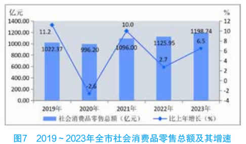 全年社会消费品零售总额实现 1198.74 亿元,比上年增长 6.5%。按城乡分,城镇消费品零售额 852.74 亿元,增长6.4% ;乡村消费品零售额 346 亿元,增长 6.5%。按行业分,批发和零售业零售额 1032.75 亿元,增长 6.8% ;住宿餐饮业零售额 166 亿元,增长 4.6%。