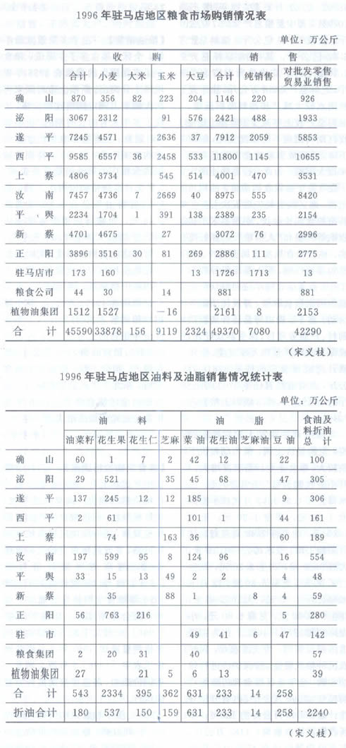【粮油收购】 1996年全区各级政府加大对农业的投资,粮食生产再创所史最好水平。粮食总产达38.92亿公斤,较上年增长10.9%,其中夏粮总产22.57亿公斤。秋粮16.35亿公斤。油料总产6.32亿公斤。其中油菜籽总产1.19亿公斤。花生总产4.57亿公斤。芝麻总产5658万公斤,由于夏秋雨水较大减产和油料面积压缩。油料总产较上年减少15.3%。夏粮收打期间因雨不同程度受灾,粮质下降,给完成国家粮食定购任务带来很大困难。为此,行署接连两次下发《关于确保收购质量》的明传电报,地区粮食局先后五次召开了县市粮食局长会议,明确要求不得收购等外粮和“人情粮”。为抓好落实,地区粮食局实行局长包片,科室包县责任制,深入基层督导收购工作。各基层收粮单位向群众广泛宜传国家粮食政策,开展优质服务活动。遂平、确山等县还开展验质到村、户服务项目,深受群众好评,确保了收购质量和入库进度。全年累计完成粮食定购任务37618公斤,占对省结算任务37033万公斤的10l%,入库3级以上粮食占70%。