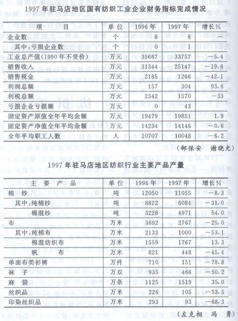 【纺织工业概况】驻马店地区纺织工业自70年代初形成规模生产以来,已发展成为拥有棉纺织、麻纺织、针织复制、丝织、服装等五大门类的较大行业。其中麻纺织业设备能力4.5套,可年产麻袋3600万条,是全省麻纺织生产规模最大的地区。行业主要产品有棉纱、棉布、麻袋、针织内衣、袜子、丝及丝织品等十几十品种。其中棉纱、麻袋、针织内衣、袜子、工装线等是区内纺织行业主要出口创汇产品。