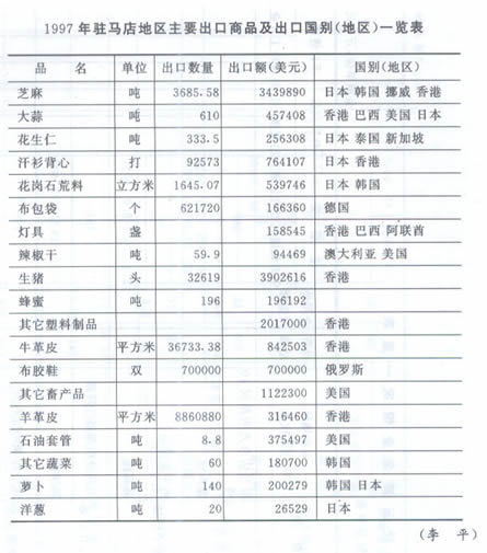 【对外贸易概况】 1997年,全区外经贸行业坚持以深化改革为动力,狠抓改革、发展、管理三项重点工作,转变观念,真抓实干,在资金短缺、市场疲软、包袱沉重的情况下,班子团结协调,职工思想稳定,经营灵活多样,新的运行机制逐步实施,全面完成了各项工作任务。全年完成进出口额1575万美元,较上年增加37万美元,增长2.4%,其中外商投资企业出口724万美元,较上年减少57万美元,下降7.39%;国有外贸企业出口851万美元,比去年增加84万美元,增长10.45%。完成商品销售额22000万元,较上年增加1585万元,增长7.76%。全区外贸系统盈亏统算亏损1268万元,较上年亏损4123万元,减亏2855万元。地直外贸系统零字承包盈利249万元,较上年减亏2663万元。在劳务合作方面。向台湾、澳门等地区派出渔船工、技工101人,较上年增长55%。
